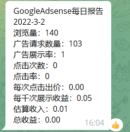 每天登陆Google Adsense查看收益有些麻烦,而平常用TG又比较多,所以尝试将每日收益推送到TG。效果如图。可以使用免费VPS Linuxone进行托管(参考本文)。